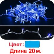Синие светодиоды на прозрачном проводе с 8-и режимным контроллером. С каждой стороны гирлянды имеется разъем-коннектор («мама-папа»). С одной стороны подсоединен шнур питания (входит в комплект), с противоположной установлен колпачок-заглушка. Используя эти разъемы можно соединить гирлянды между собой последовательно в цепочку до 5 гирлянд с одним шнуром питания.
