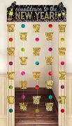 Красочный Новый год с яркой табличкой над входом и занавесом из блестящих поздравлений Happy New Year и разноцветных конфетти. В набор входит баннер из плотного картона и 5 прикрепленных к нему подвесок на леске.Общий размер декорации 99 x 195,5см.