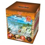 Эффект: Красные звезды раскрываются красными георгинами с пестиком серебряного мерцания, зеленые звезды раскрываются золотым кокосом в мерцании, в финале залп синих ярких звезд.