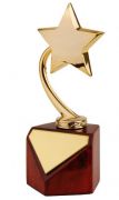 Наградная Статуэтка из металла выполнена в виде летящей звезды, оставляющей за собой след. Звезда - традиционный символ в наградах, обозначающий высокие стремления. Деревянное основание стелы изготовлено с декоративным скосом спереди и с укрепленной на скосе золотой металлической табличкой.